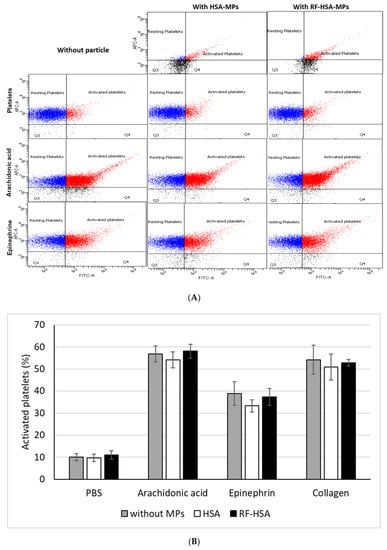 The effect of the HSA-MPs and RF-HSA-MPs on the function of the blood platelets was tested in a platelet-rich plasma (PRP). The PRP was isolated from human whole blood anticoagulated with sodium citrate by centrifugation at 150× g for 15 min and used immediately. Then the HSA-MPs and RF-HSA-MPs were added to the PRP at a final ratio of 5 particles per 1 platelet, carefully mixed and incubated in a water bath at 37 °C for 30 min. A negative control was prepared adding the same volume of PBS instead of particle suspension. To induce activation and aggregation of the platelets, the pre-incubated PRP samples were treated with 0.5 mg/mL of arachidonic acid or 0.018 mg/mL of epinephrine (Mölab, Langenfeld, Germany) at 37 °C for 30 min. An ABX Micros 60 hematology analyzer (Horiba Europe GmbH) was used to detect the platelet number in the samples before and after incubation. Finally, the platelets were stained with APC-mouse anti-human CD41a and Alexa Fluor® 488-mouse anti-human CD62p (p-selectin), kept in the dark for 20 min, and fixed with 500 µL of a fixative solution (0.5% paraformaldehyde in PBS) to each test tube to stop the reactions. The expression of the platelet activation marker CD62P and the constitutively present platelet marker CD42b were analyzed using a flow cytometry (BD FACS Canto II).