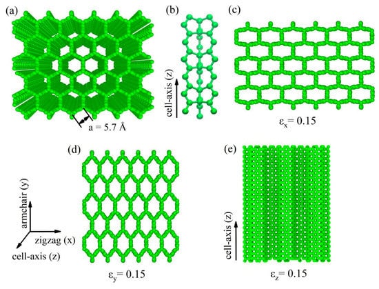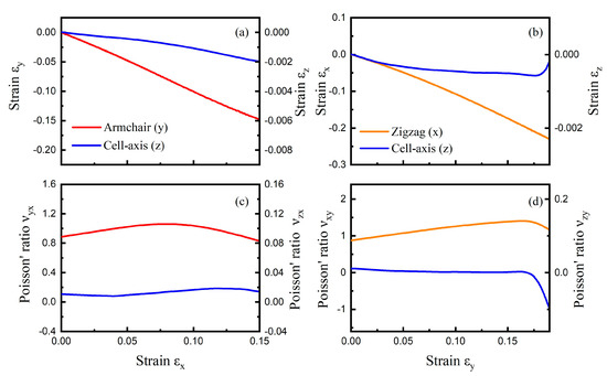 Tensile strain applied to the zigzag direction introduced nearly the same amount of compressive strain in the armchair direction (Figure 2a), which is in agreement with DFT calculations in literature [24]. was about 0.9 at zero strain. was around 0.013 at the tensile process, which is far less than . The Poisson’s ratio of CHC varied with tensile strain, which is consistent to that of foam with NPR [33]. For tensile strain up to 0.19 applied to the armchair direction of CHC, the strains and as a function of are shown in Figure 2b, and the calculated Poisson’s ratios are shown in Figure 2d. It can be seen that decreased from 0 to −0.22, and were around 1.0 when tensile strain increased from 0 to 0.19. In general, the Poisson’s ratio along the armchair (or zigzag) direction was larger than that along the cell-axis direction when the tensile test was applied in the zigzag (or armchair) direction.