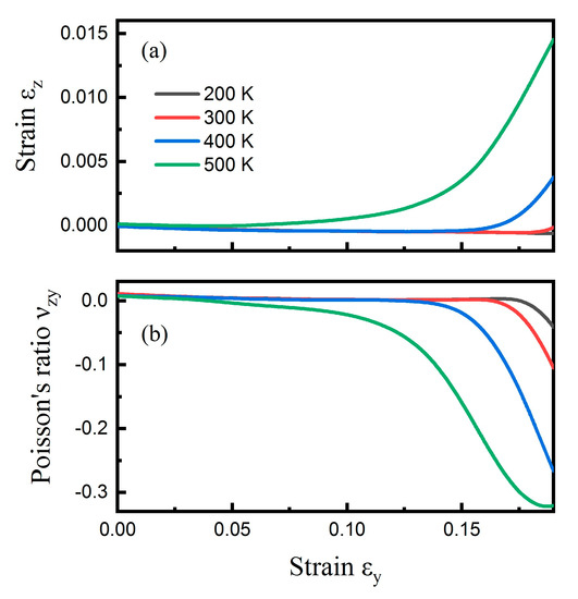 Regarding the armchair direction, Figure 4a shows the correlation between and up to 0.19, at the temperature range from 200 to 500 K, when CHC was subjected to uniaxial tensile deformation along the armchair (y) direction. It can be seen that higher temperatures induced a bigger transverse strain at the same tensile strain . The decreased slowly, and then increased with respect to an increasing tensile strain, indicating that there existed a NA transition. The corresponding Poisson’s ratios for CHC at different temperatures are shown in Figure 4b. At zero strain, were around 0.009, the same for all four temperatures. It decreased from positive to negative with the increase of tensile strain. The higher the temperature, the smaller the critical strain for the NA transition. It occurred at about 0.175, 0.168, 0.122, and 0.039 tensile strain for temperature of 200, 300, 400, and 500 K, respectively. A minimum Poisson’s ratio as small as approximately −0.32 was achieved at 500 K.