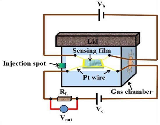All the gas sensing performances were measured in a static system, and the volume of the gas chamber was 20 L as shown in the Figure 1. Firstly, the prepared gas sensors were connected with the testing system by Pt wires according to the Figure 1. A 10 V regulated power (Vc) was obtained by a DC power supply (Agilent U8002A, San Jose, CA, USA), and the value of load resistance (RL) was 10 Mohm. The output voltage (Vout) of load resistance was collected by a multimeter (Agilent mod, U3606A, San Jose, CA, USA). By a simple calculation, the resistance changes of sensing devices (Rg and R0) were obtained, where Rg and R0 is the resistances of the sensor devices after and before exposure to target gas. In the process of testing, a certain amount of target gas was obtained from a standard NH3 cylinder with the concentration of 20,000 ppm, which was injected into the gas chamber by a syringe and diluted to the target concentration. The target concentration was calculated based on the injected amount of target gas. If 1 mL standard NH3 was injected into the gas chamber, the concentration of NH3 was 1 ppm. Then the resistance of sensing devices (Rg) under different concentration of target gas was obtained. All the measurements were operated at room temperature (25 °C), and the heating voltage (Vh) was always 0 V. Meanwhile, the relative humidity (RH) was remained at 60%.