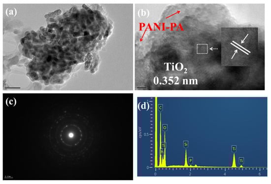 The transmission electron microscope (TEM) photograph of TiO2@PANI products at m (TiO2)/m (Ani) = 2 is shown in Figure 3a. It can be clearly seen that the TiO2 crystallites are about 20 nm in size. The spacing of the lattice stripe of TiO2@PANI is about 0.352 nm, which corresponds to the TiO2 (101) crystal plane of anatase in Figure 3b [23]. On the surface of TiO2 NPs polyaniline film can be seen and the thickness of the coating is about 5 nm, but there is no lattice stripe or diffraction pattern for this poor crystalline substance. Figure 3c is the selected area electron diffraction pattern of the TiO2@PANI, and it mainly also corresponds to the TiO2 (101) plane of anatase phase [24]. It also indicates that the TiO2 nanoparticles are polycrystalline particles. From the energy spectrum of the TiO2@PANI (measured by the SU8020, Figure 3d), it is visible that the products contain the elements of the PANI. The silicon in the energy spectrum corresponds to the silicon wafer substrate. These mean that the TiO2 NPs coated by PANI have been successfully prepared by the above method.