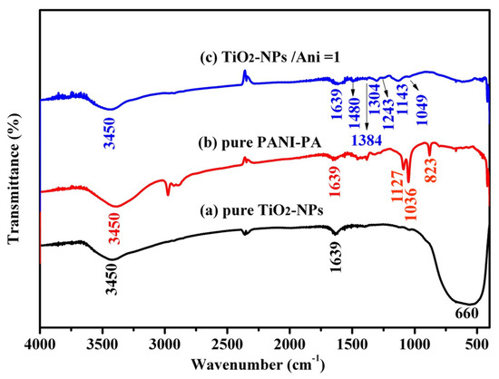 In order to demonstrate the characteristic peaks of the products, the FTIR spectrum of pure TiO2 NPs, the pure PANI and the TiO2@PANI samples at m (TiO2)/m (Ani) = 2 is measured, and the results are shown in Figure 4. In the FTIR spectra of pure TiO2 NPs (Figure 4a), only three main absorption peaks are found. The wide peak at the 660 cm−1 is caused by the stretching vibration of the Ti-O bond in the NPs [25]. The sharp absorption peak near the 1639 cm−1 is due to the characteristic absorption peak of water in TiO2 NPs, which adsorbs the water of the air [26]. The broad peak at 3450 cm−1 is caused by the stretching vibration of hydroxyl groups [27]. In Figure 4b,c, several characteristic absorption peaks appeared; the peak at 1143 cm−1 corresponds to N=C stretching mode of the quinoid units [28]. The absorption peak near 1304 cm−1 is C-H stretching vibration of the benzene ring [29], and at the 823 cm−1 it is the C-H outer bending vibration on the symmetric substitution of the benzene ring [30]. At 1480 and 1384 cm−1 it is the C=C stretching vibration of the benzene ring, and the peak at 1127 cm−1 is associated with quinonoid unit. The peak at 1036 cm−1 is due to in-plane vibration of C-H bending mode [31]. The appearance of these peaks indicates that the products have the molecular structure of PANI. Comparing the infrared absorption spectra of TiO2@PANI and pure TiO2 NPs, it is found that the absorption peak near 660 cm−1 is weaker for the TiO2@PANI, while the other peaks are largely unchanged. That is because the surface of TiO2 NPs are coated by PANI. At the same time, the characteristic absorption intensity of PANI (1127, 1036 and 823 cm−1) is also weakened for the TiO2@PANI. The reason is that there is a strong interaction between PANI and TiO2 NPs. The strong interaction may be associated with the interaction of titanic and nitrogen atom in PANI. As titanium is a transition metal, it has intense tendency to form coordination compound with nitrogen atom in PANI. This interaction may weaken the bond strengths of PANI. Moreover, the action of hydrogen bonding between TiO2 NPs and PANI is also contributory to this weakness of bands [32].