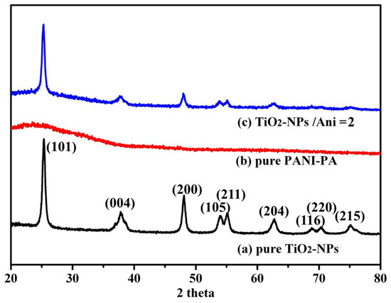 XRD pattern of (a) pure TiO2 NPs; (b) the PANI films prepared by phosphoric acid and (c) TiO2@PANI sample produced at m (TiO2)/m (Ani) = 2.