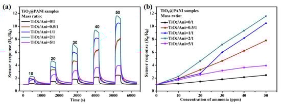 (a) Sensor response of the TiO2@PANI samples with different m (TiO2)/m (Ani) to NH3 gas ranging from 10 to 50 ppm at room temperature; (b) the corresponding sensitivity curve.
