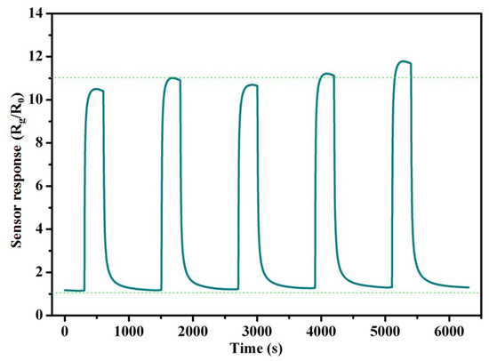 The repeatability is also a very important index for gas sensors. So the repeatability response curves of TiO2@PANI samples with m (TiO2)/m (Ani) = 2 are measured under 50 ppm ammonia as shown in Figure 8. It can be seen that the sensor response after five repeats is 10.7, 11.0, 10.8, 11.2 and 12.0 at room temperature. There are little noticeable changes, which means that the gas sensors have a good stability for NH3 gas and it is favorable for industrial applications.