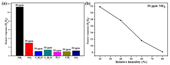 Including the sensor response and repeatability, the selectivity of gas sensors is also an important index. Here, six different kinds of gases such as nitrogen dioxide (NO2), ethanol (C2H6O), acetone (C3H6O), hydrogen sulfide (H2S), methane (CH4) and sulfur dioxide (SO2) are selected as the interference gases. In Figure 9a, it can be seen that the sensor response to 50 ppm ammonia, 50 ppm nitrogen dioxide, 50 ppm ethanol, 50 ppm acetone, 50 ppm hydrogen sulfide, 50 ppm methane and 50 ppm sulfur dioxide is 11.3, 3.0, 1.1, 1.4, 0.9, 1.0 and 1.2 at room temperature, respectively. There is a significant difference between the interfering gases and the target gas. The sensor shows weak response to the interfering gases. The reason is that only NH3 gas has the interaction with the protons in the PANI, and the interfering gases have little interaction with the PANI or TiO2 NPs. At high temperature these interfering gases may have interaction with the PANI or TiO2 NPs and it will be investigated in the further. In view of an industrial application, the influence of relative humidity (RH) should be considered. All the above experimental results are obtained under 60% of RH at room temperature. Now the value of RH is changed from 20 to 80% as shown in Figure 9b. It can be seen that under different relative humidity conditions the sensor response with m (TiO2)/m (Ani) = 2 is 21.8, 17.7, 11.8 and 8.2 to 50 ppm NH3 gas. At 80% RH, it has the worst performance. The reason is that as the value of RH increases, the active sites of gas sensor are occupied by more water, which results in the decrease of detection sites to NH3 gas, and the performances of the gas sensor becomes worse.