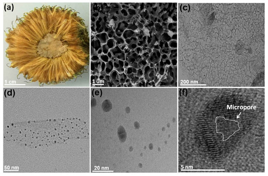 (a) Photograph of Platanus biomass. (b,c) SEM and TEM images of porous carbon (PC) after KOH activation. (d–f) TEM and high-resolution TEM (HR-TEM) images of NM-CQDs.