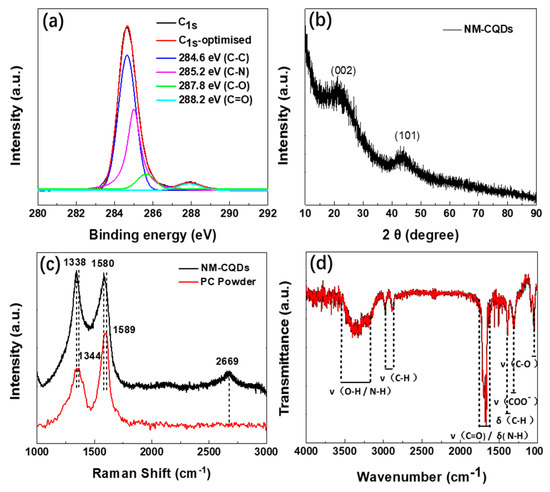 (a) High-resolution C1s spectrum of NM-CQDs (red curve), and four fitting components (blue, magenta, green, and cyan curves). (b) X-ray diffraction (XRD) patterns of NM-CQDs. (c) Raman spectra of NM-CQDs and PC powder with an excitation wavelength of 532 nm. (d) Fourier-transform infrared (FTIR) spectrum of NM-CQDs.