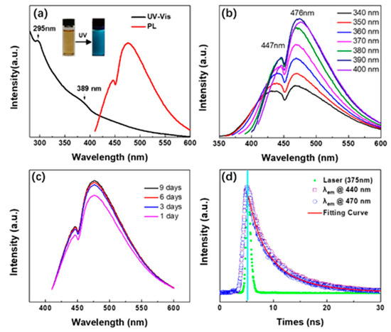 Evidently, the supernatant of NM-CQDs was yellow in color under room-light irradiation, while indigo–blue emission could be observed under UV-lamp (λ = 365 nm) irradiation in the inset of Figure 4a. Two absorption bands centered at 295 nm and 389 nm can be clearly observed in the UV–Vis spectrum. Interestingly, two coexisting distinct emission bands centered at 447 nm and 476 nm could also be seen in the PL emission spectrum. The PL emission peak centered at 476 nm was much stronger than that of the peak centered at 447 nm, displaying the indigo–blue emission. Unlike most of the reported CQDs [42,43,44], PL emission bands of NM-CQDs synthesized in formamide by PLA remained unshifted with the excitation wavelengths changing. The centers of the two bands were always situated at 447 nm and 476 nm in Figure 4b, whereas the PL intensities of the NM-CQDs increased first and then decreased as the excitation wavelengths changed from 340 to 400 nm. The PL intensity was maximum when NM-CQDs were excited with a wavelength of 390 nm. It can be noted that the intense and stable PL emissions were not derived from formamide molecules. This phenomenon can be certified by comparing the PL emission intensities of formamide (dotted line) to those of NM-CQDs (solid line) in Figure S7 (Supplementary Materials). Figure 4c shows the PL emissions of NM-CQDs with an excitation wavelength of 390 nm from the first to the ninth day. The PL emission intensities of the NM-CQDs were enhanced as time was prolonged because the agglomeration of particles made the non-radiative transitions of excited electrons reduce with prolonged time [45,46]. The intensities tended to be stable with the high quantum yield of 32.4% until the ninth day (see Figure S8, Supplementary Materials). According to previous reports [33,47,48,49], species, such as amine moieties, are crucial to improving PL properties of CQDs. Here, apart from formamide, ethyl acetate (EA) and ethylene glycol (EG) were also employed to investigate whether passivation with different solvents would impact the quantum yields of the CQDs by means of PLA. Obviously, TEM and HR-TEM images showed that NM-CQDs synthesized in different solvents were still monodispersed and possessed a distinct lattice and a micropore (see Figure S9, Supplementary Materials). Unlike NM-CQDs synthesized in formamide, non-doped CQDs, i.e., M-CQDs-EA and M-CQDs-EG, lacked N elements (see Figure S11a,b, Supplementary Materials). Compared with M-CQDs-EG, M-CQDs-EA had more C=O groups (see Figure S10c,d, Supplementary Materials). Furthermore, the quantum yields of M-CQDs-EA and M-CQDs-EG were only 15.5% and 6.3%, respectively, indicating that the nitrogen-containing groups were beneficial for increasing the QY of CQDs. As a comparation, N-CQDs from non-microporous carbon precursors were also synthesized in formamide solvent to investigate the effect of microporous structure on PL emission. TEM and HR-TEM images showed N-CQDs were absent of a microporous structure (see Figure S11a,b, Supplementary Materials). Compared with NM-CQDs, N-CQDs had fewer defects (ID/IG = 0.87) and showed a relatively weaker PL emission (see Figure S11c,d, Supplementary Materials), which indicated that the introduction of microporous structure can further improve the quantum yield of CQDs. Furthermore, fluorescence intensities of NM-CQDs were stable under high salt ionic concentrations (up to 400 mM NaCl) and a wide range of pH values (pH 4–9) (as shown in Figure S12a,b, Supplementary Materials). PL intensities of NM-CQDs were almost unchanged with the same excitation wavelength after 1800 s (as shown in Figure S12c, Supplementary Materials), indicating that the indigo–blue emission of NM-CQDs prepared by PLA was stable for a moment. In addition, Figure S12d (Supplementary Materials) shows that the PL intensity also decreased slightly when temperature changed from 293.15 K to 393.15 K, which indicated that the strong, stable, and excitation-independent indigo–blue PL emission of NM-CQDs originated from the surface states [43]. Finally, the PL lifetime of NM-CQDs was also detected using a fluorescence spectrometer. The differently colored discrete dots in Figure 4d display the PL decay profiles of the NM-CQDs by monitoring PL peaks at 447 nm (violet squares) and 476 nm (blue circles) with an excitation wavelength at 375 nm using a time-correlated single photon counting method. The corresponding instrument response curve is also given in Figure 4d. The lifetime data of NM-CQDs were fitted with the triplet-exponential function shown below.