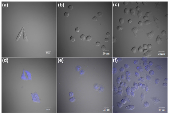 (a–c) Confocal microphotographs of live HeLa cells, L02 cells, and macrophage cells without NM-CQD incubation, respectively. (d–f) Confocal micro-photographs of live HeLa cells, L02 cells, and macrophage cells incubated with 40 µL of NM-CQDs at 37 °C for 3 h, respectively. Detection of NM-CQD fluorescence in cells was achieved using a 405-nm laser as an excitation source.