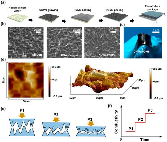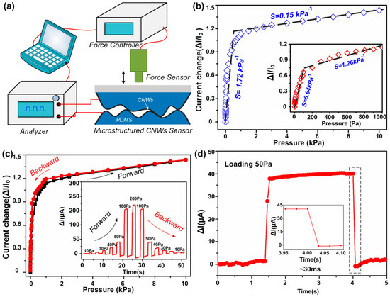 Figure 2a illustrates the characterization system. Precise pressure is applied by the force controller. The pressure probe feeds back the pressure values to the system in real time. Current signals are collected by the analyzer. The pressure sensor made from CNWs-coated rough silicon wafer exhibits high sensitivity and large linearity.
