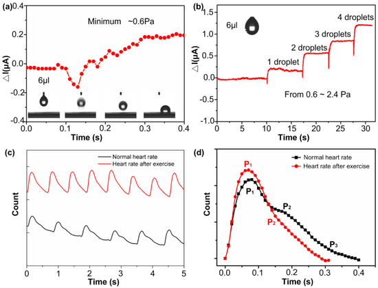 Figure 4b that the high-sensitivity pressure sensor responded to tiny droplets that were continuously dripping. The value of the pressure ranges from 0.6 to 2.4 Pa. As can be seen from