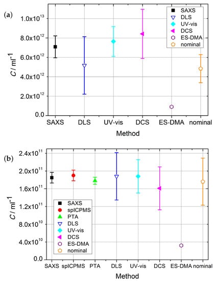 From Table 2 as well as Figure 2a,b it is visible that, for Au10 and Au30 samples, with the exception of the ES-DMA-CPC method, all the methods are in close agreement. All laboratory methods agree with the result provided by SAXS for the Au10 sample. Only ES-DMA-CPC deviates for this sample by a factor of eight. The sample measured by all available methods was the Au30 sample. With the exception of the ES-DMA-CPC method, which differed by a factor of six, all other methods provided results which agreed within their uncertainties. The DCS/DLS measurement yielded a value ≈ 11% lower than SAXS, spICPMS, PTA and DLS, but still within the range of the uncertainties.
