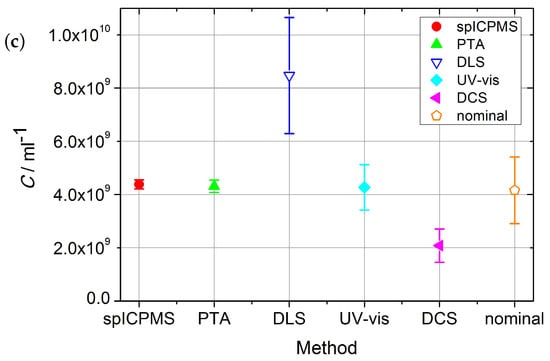 Small-angle X-ray scattering (SAXS) and single particle inductively coupled plasma mass spectrometry (spICPMS) are defined as reference methods. Here the dynamic mass flow method of spICPMS was used. Both methods fulfill the requirement as methods of exceptional scientific status which are sufficiently accurate to stand alone in the determination of number concentration for the certification of a reference material. The two methods also have a firm theoretical foundation so that systematic error is negligible relative to the intended use [16]. The laboratory methods investigated were particle tracking analysis (PTA), dynamic light scattering (DLS), which was used as a stand-alone method or with differential centrifugal sedimentation (DCS) to provide the particle size, ultraviolet visible spectroscopy (UV-vis), and electrospray-differential mobility analysis with a condensation particle counter (ES-DMA-CPC). Here, the focus was on a variety of methods, which are accessible and highly represented in industry (e.g., tabletop, easy-to-use, analysis software, etc.). For example, PTA fulfills the definition of a reference method used above, however SAXS and spICPMS are both traceable respective to number concentration directly to a SI unit (metre for SAXS and kilogram for spICPMS), which means that these methods are directly related to the respective SI-unit via an unbroken chain of comparisons, each having a stated uncertainty [11,14,17]. The traceability substantiate a foundation of the methods on nature constants, which is crucial for metrology. None of the laboratory methods is traceable to a SI-unit respective to the number concentration measurements.