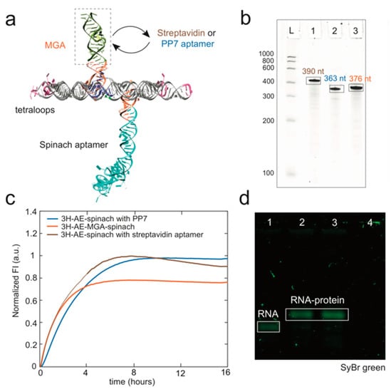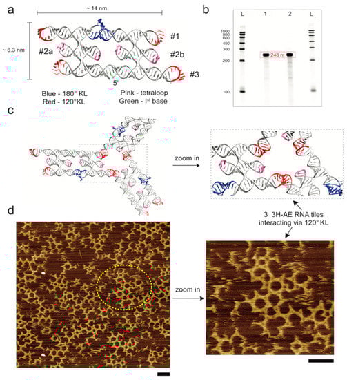 - Afonin, K.A.; Kireeva, M.; Grabow, W.W.; Kashlev, M.; Jaeger, L.; Shapiro, B.A. Co-transcriptional Assembly of Chemically Modified RNA Nanoparticles Functionalized with siRNAs. Nano Lett. 2012, 12, 5192–5195. [Google Scholar] [CrossRef] [PubMed]