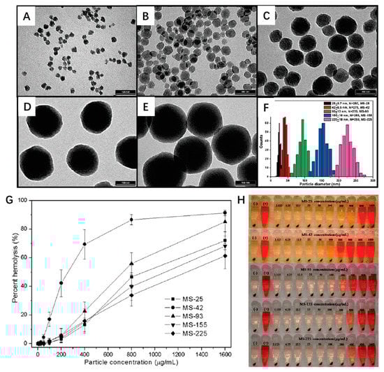 - Lin, Y.-S.; Haynes, C.L. Impacts of mesoporous silica nanoparticle size, pore ordering, and pore integrity on hemolytic activity. J. Am. Chem. Soc. 2010, 132, 4834–4842. [Google Scholar] [CrossRef] [PubMed]