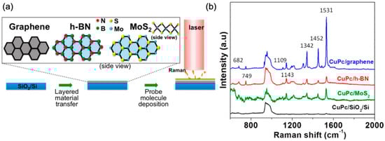 (a) Experimental schematics of GERS. 2D materials are mechanically exfoliated onto a SiO2/Si substrate. CuPc molecules are thermally evaporated under vacuum onto the 2D materials. Raman measurement is performed under a 633 nm laser excitation. (b) Raman spectra of CuPc on graphene (blue), h-BN (red), MoS2 (green), and blank SiO2/Si substrate (black). Reproduced from [31] with permission (American Chemical Society, 2014).