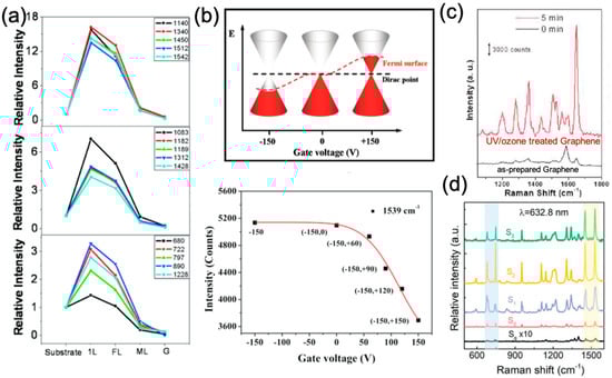 Benefitting from the tunability of the electronic properties of 2D materials through electric field gating, doping, or surface chemical functionalization, numerous studies have been carried out to investigate the influence of the property changes of 2D materials on the enhancement effect. In this context, Xu et al. reported that the EF is sensitive to the position of the graphene’s Fermi level (EF). As shown in Figure 3b, the Fermi level of graphene will be downshifted by applying a negative gate bias, and upshifted upon applying a positive gate bias [45]. The Raman intensity of the 1539 cm−1 mode of the CoPc molecule increased as the energy difference between the downshifted graphene EF and the lowest unoccupied molecular orbital (LUMO) coincided with the excitation laser energy, which is in accordance with the CM [50]. The authors concluded that the band alignment between the cobalt-Pc (CoPc) molecule and graphene was responsible for the changes of the Raman intensities of the molecules on graphene.