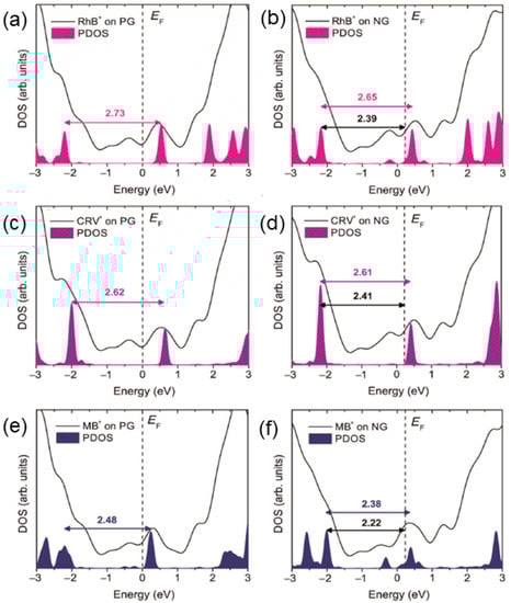 Densities of states (DOS) of the clusters representing the adsorbed organic dyes on PG and NG. (a,b) for rhodamine B (RhB); (c,d) for crystal violet (CRV), and (e,f) for methylene blue (MB). The filled areas are the densities of states (PDOS) projected on the dyes. Vertical dashed lines indicate the position of the system’s Fermi energy, EF. Horizontal arrows and values indicate the HOMO-LUMO gaps in electronvolt (eV), and the energy, HOMO-EF, in eV [18].
