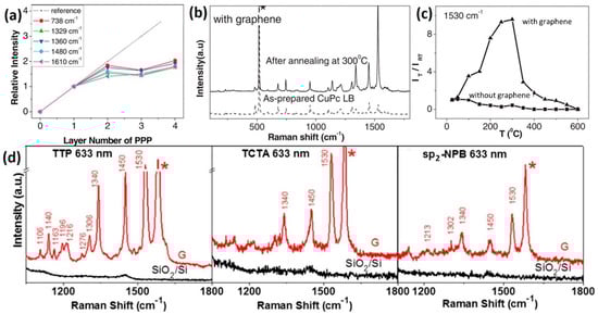 (a) First-layer effect in GERS of PPP molecules deposited using an LB technique. Reproduced from [55] with permission (Wiley-VCH, 2010). (b) Enhanced Raman scattering of CuPc on graphene after annealing treatment due to the change of the molecular orientation. (c) Intensity change of the 1530 cm−1 mode as a function of the annealing temperature. Reproduced from [56] with permission (Wiley-VCH, 2012). (d) GERS effect for tetrathienophenazine (TTP), tris(4-carbazoyl-9-ylphenyl) amine (TCTA), and 2,2′7,7′-tetra(N-phenyl-1-naphthyl-amine)-9,9′-spirobifluorene (sp2-NPB) molecules. Reproduced from [57] with permission (American Chemical Society, 2015).