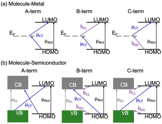 With the opening of a bandgap in 2D semiconductors, such as MoS2 and WSe2, the A-, B-, and C-terms undergo slight modifications. In addition to a new excitonic resonance in the semiconducting 2D materials, the CT resonances in the A-term can occur from the HOMO of the molecule to the conduction band (CB) of the semiconductor, or from the valence band (VB) of the semiconductor to the LUMO of the molecule. Charge-transfers in the B-term occur from the HOMO to the CB through intensity borrowing of an excitonic resonance (μEx: Transition dipole moment of the excitonic resonance), which is made possible by the vibronic coupling of the HOMO and the VB (hHV). The CT contributing to the B-term can also occur from borrowing the intensity of a molecular resonance (μMol: Transition dipole moment of the molecular resonance), by the vibrionic coupling between LUMO and CB (hCL). The CT contribution to the C-term is very similar to the B-term, but with the CT between the VB of the 2D semiconductor and the LUMO of the molecule. The vibronic couplings and excitonic and molecular resonances responsible for the C-term are the same as that for the B-term, as shown in Figure 6b. In particular, the charge-transfer dipole moment (μCT) for B- and C-terms will be large when the vibronic coupling is strong. Moreover, as all resonances and couplings are linked [59,60], large signal enhancements should be expected when the laser excitation energy matches one or more of the following: (1) μCT; (2) μMol; and; (3) μEx [61].