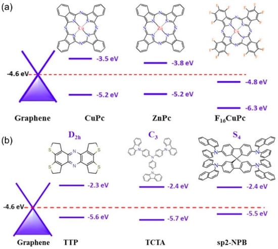 Energy band alignment between graphene’s Fermi level and several molecules with (a) similar symmetries, but differing HOMO-LUMO positions (CuPc, ZnPc, F16CuPc), and (b) different symmetries with similar HOMO-LUMO positions (TTP, TCTA, sp2-NPB) [57].
