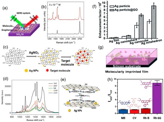 Further refinements of the G/Ag system includes the work of Li et al., who used G/Ag to selectively detect polar antibiotic compounds in water [81]; Fan et al., who demonstrated the tuning of EF by changing the shape of the nanoparticles [76] (Figure 8f); and Liu et al., who showed increased sensitivity by using Ag nanorods to monitor the concentration of iodine in solutions, all of which enable rapid and facile detection of the target analyte at concentrations of 10−8 M, 10−9 M, and 10−10 M, respectively [82]. Beyond Ag nanoparticles, Carboni et al. have proposed a nanocomposite made of graphene nanosheets dispersed in mesoporous titania, or Ti-GERS [83]. Though the exact enhancement mechanism for this nanocomposite has not yet been elucidated, it is capable of achieving an analytical EF of 16 times when compared to normal Raman scattering. Another approach, reported by Zhang et al., combines silver-coated gold nanoparticles (Au@Ag NPs) with GO in a layered sandwich structure for in-situ detection of the pesticide thiram, down to 10−7 M concentrations [84]. In addition, Jiang et al. have improved the molecular imprinting method by combining the polymer matrix with dispersed GO/Ag nanosheets (Figure 8g), and achieved an EF of 712 with respect to Raman scattering without enhancement, and an impressive selectivity, with Rh6G having an EF around 8 times larger than rhodamine B [77] (Figure 8h).