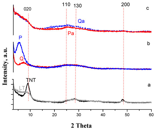 The Brunauer–Emmett–Teller (BET) specific surface areas of the samples are presented in Table 1. All starting materials (LT, ZnP, and Q) show specific surface areas ranging between 170–200 m2/g, which indicates the production of mesoporous materials with average pore size around 5 nm. The NaOH treatment produces important loss of specific area due to the pore shrinking to around 2 nm for all samples (TNT, Qa, ZnPa).
