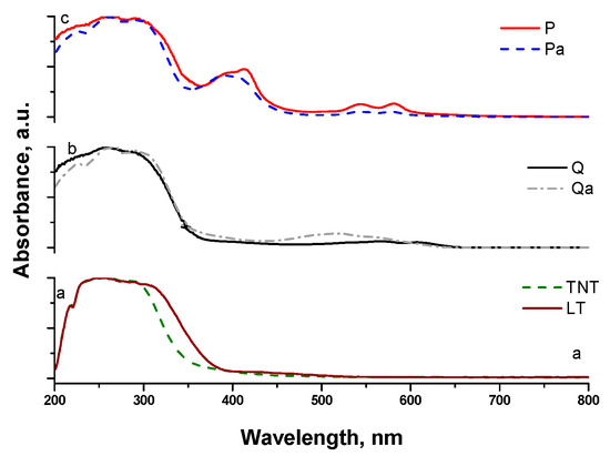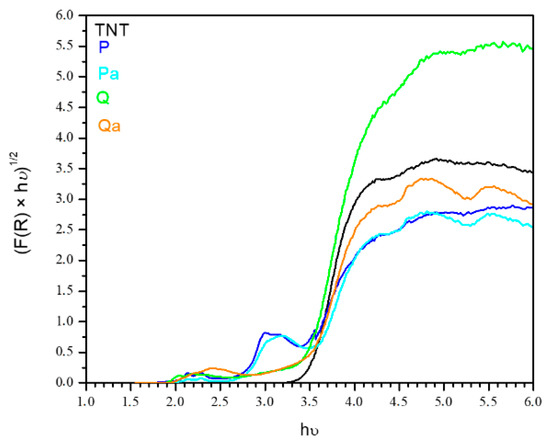 The typical band edge of the TiO2 semiconductor was observed for all samples near 350 nm. The sensitized materials present also absorption in the visible range (400–700 nm) compared to bare titania materials (Figure 3a). The quinizarin sensitized titania shows maximal absorbance in the 450–570 nm range, which could be shifted as a function of the structuring charge [29,30]. Thus, the neural quinizarin absorbs in 455–496 nm range, monoanionic at 554–569 nm and dianionic at 550 nm. The optical spectra of the Q sample indicate the presence of mono and dianionic quinizarin species interacting with the Ti–O skeleton, whereas the Qa bands shift to the lower wavelength indicating the loss of charge of the quinizarin molecules. The latter could be explained by the presence of Na+, which could compensate the charge of the colorant, thus, producing the observed blue shift. However, bands centered at 510 nm indicate either a partial quinizarin charge compensation or the blue shift could be produced by the confinement effect by the nanotube formation.