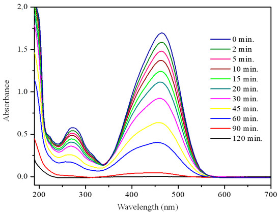 Figure 6 represents the evolution of methyl orange absorbance during 120 min of photoreaction time by using commercial TiO2 P25. As it was previously indicated in Section 2.3, the main absorption band located at 465 nm was employed to estimate the MO concentration. The intensity of this band decreases as the reaction time increases, which indicates the breaking of the chromophore group corresponding to the azo group (N=N) present in the molecule of MO. It is important to note that the absence of new signals in the spectra confirms the degradation of the dye being treated; any reaction intermediate product was detected even after 120 min of reaction time. The UV-Vis spectra obtained with other photocatalysts are not included for the sake of brevity, but similar behavior as described here was observed for P25.