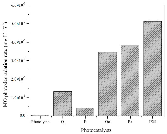 The photocatalytic degradation rate of methyl orange over the analyzed catalysts is represented in Figure 7 and it is observed that the substrate photolysis is negligible, thus, indicating that the presence of a photocatalyst is necessary to induce the highest degradation rate of MO.