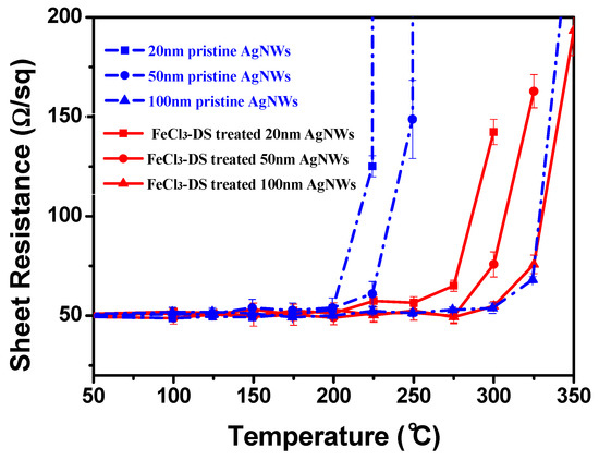 Sheet resistance variation of AgNW TCFs of AgNWs with different diameters in the thermal test: pristine AgNWs (blue lines) and 60 min FeCl3-DS treated AgNWs (red lines).