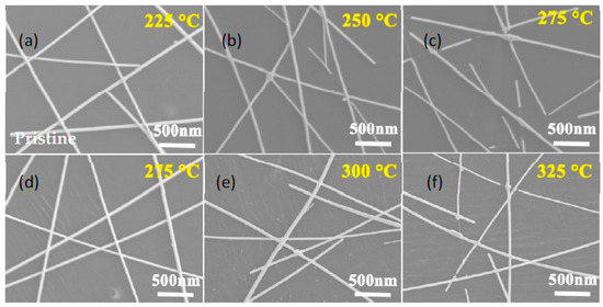 SEM images of pristine and 60 min FeCl3-DS treated AgNW TCFs of 50 nm-thick AgNWs under different thermal test temperatures: (a) 225 °C, (b) 250 °C, and (c) 275 °C for pristine AgNWs; (d) 275 °C, (e) 300 °C, and (f) 325 °C for 60 min FeCl3-DS treated AgNWs.
