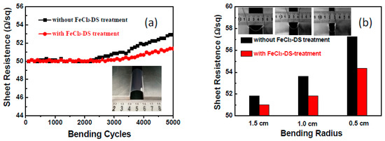 Overall, the FeCl3-DS treatment not only improves the conductivity and stability of AgNW TCFs, but also enhances their mechanical flexibility.