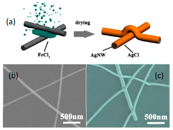 The Supplementary Materials are available online at https://www.mdpi.com/2079-4991/9/4/533/s1. Additional SEM, TEM, SAED, XPS and EDS data, the electrical and optical properties of FeCl3-DS treated AgNW TCFs and a schematic of Fermi level shift and reaction potentials.