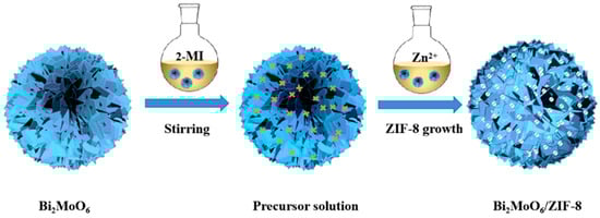 The preparation process of Bi2MoO6/ZIF-8 via the self-assembly method.