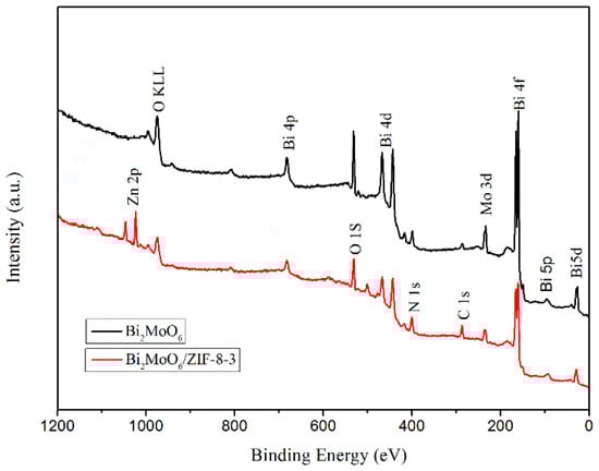 Survey X-ray photoelectron spectroscopy (XPS) spectrum of pure Bi2MoO6 and Bi2MoO6/ZIF-8-3.