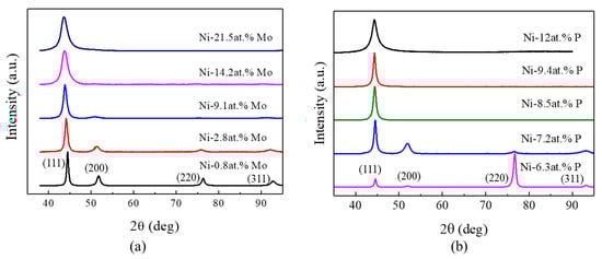 The microstructural characterization on the prepared Ni-Mo and Ni-P samples with different Mo and P contents was performed by XRD. Figure 2a presents the X-ray profiles of Ni-0.8 at.% Mo, Ni-2.8 at.% Mo, Ni-9.1 at.% Mo, Ni-14.2 at.% Mo [16] and Ni-21.5 at.% Mo. All the samples exhibit a strong (111) diffraction peak. Broadened diffraction peaks, as designated in the figure, are observed on Ni-0.8 at.% Mo, which correlates with the single-phase face centered cubic (fcc) structure. The peaks get broader, with more Mo atoms codeposited in the alloys. When the atomic percentage of Mo gets as high as 21.5, only the (111) diffraction peak is observable, showing a reduction of grain size with higher Mo contents. The grain sizes calculated from the peaks by using Scherrer equation are 16 nm, 11 nm, 8 nm, 4 nm and 2 nm, corresponding to ng the Ni-Mo samples with 0.8, 2.8, 9.1, 14.2 and 21.5 at.% Mo, respectively. The minimum average grain size of 2 nm was achieved in the Ni-21.5 at.% Mo sample.