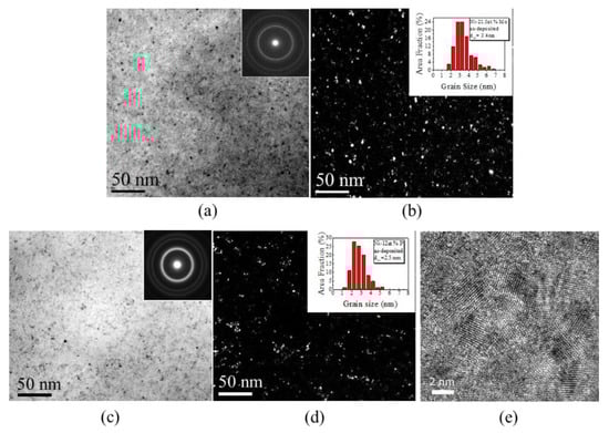 Figure 3c,d give the BF and DF images of Ni-12 at.% P. There appears no distinct difference between ng Ni-12 at.% P and Ni-21.5 at.% Mo in the BF and DF images, nor in the SAEDs (insets of Figure 3a,c). The statistic grain size distribution (the inset of Figure 3d) shows that the average grain size of Ni-P is as small as 2.5 nm, very close to that achieved in Ni-21.5 at.% Mo of 3.4 nm.