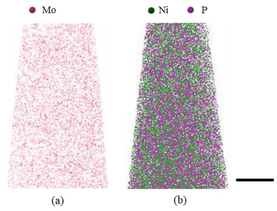 3D atomic probe tomography (APT) results of (a) as-deposited Ni-14.2 at.% Mo (red dots stand for Mo atoms) and (b) Ni-8.5 at.% P (green for Ni with purple P) exhibiting homogeneous distribution of both solute and solvent atoms (Ni, Mo and P). Scale bar in the figure is 20 nm.