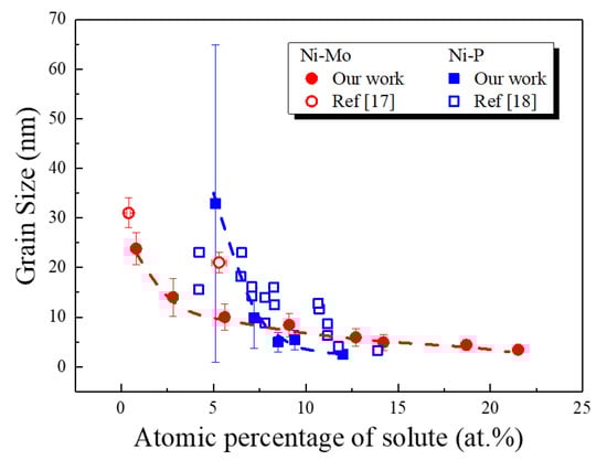 Grain size dependence of ng Ni-Mo alloys and Ni-P alloys on the atomic percentage of the solute atom (Mo and P), with the red line standing for Ni-Mo and the blue one representing Ni-P, respectively. The red circles stand for data of Ni-Mo, with blue squares representing those of Ni-P; the solid symbols are our results, with hollow ones being from references [17,18].