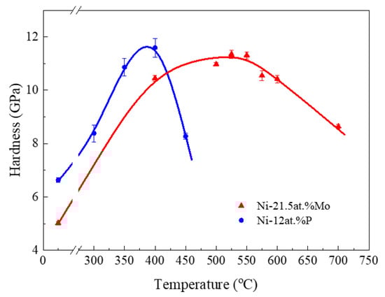 Variation of microhardness as a function of the annealing temperature with a duration of 1 h for ng Ni-21.5 at.% Mo (red line) and Ni-12 at.% P alloy (blue line).
