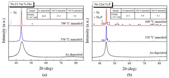 To reveal the microstructure evolution during annealing, XRD detection was performed on the annealed Ni-21.5 at.% Mo and Ni-12 at.% P samples, as presented in Figure 7a,b, respectively. Compared with the XRD pattern of the as-deposited Ni-21.5 at.% Mo sample, the (111) diffraction peak narrowed when annealed at 550 °C. The TEM observation indicated that the corresponding grain size increased to about 15 nm. After being annealed at 700 °C for 1 h, more diffraction peaks of fcc appear in the diffraction pattern of ng Ni-Mo. In addition, the full-width at half-maximum (FWHM) value of the (111) diffraction peak (inset of Figure 7a) decreased tremendously from the initial 68.8 × 10−3 to 5.9 × 10−3 rad, exhibiting a significant grain growth corresponding to the much lower hardness of about 8 GPa, as shown in Figure 6. Although no diffraction peaks of a second phase were detected by XRD, precipitation at this annealing temperature cannot be excluded.