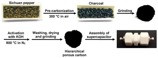 Sichuan pepper, widely known as Huajiao in China, denotes the fruits of Zanthoxylum in the plant family Rutaceare, which is a popular spice for culinary purposes and can be used as drug in traditional Chinese medicine for anti-microbial, anti-inflammation and analgesia [18,19]. Moreover, plenty of extracts are able to be obtained from Sichuan pepper as well, and they are extensively added as food ingredients in many savory goods and beverages [18,20]. Despite these merits and efforts, it is of great significance to expand the application of Sichuan pepper into other important and valuable aspects such as energy storage area. In the present work, this raw material was employed as a sustainable and green precursor to prepare hierarchical porous carbon via pre-carbonization followed by KOH activation under high temperature (Figure 1). Thanks to the interconnected micro-mesoporous structure, high specific surface area, and well-developed porosity, the currently synthesized porous biomass carbon displayed satisfactory capacitive performances with the maximum specific capacitance of ca. 171 F g−1 in a three-electrode system, the highest energy density of 4.2 Wh kg−1 in a symmetric supercapacitor cell, as well as outstanding rate capability and cycling stability. The current method to fabricate hierarchical porous carbon is straightforward and suitable for mass production. Consequently, a type of cost-effective and environmental friendly carbon electrode materials is developed for energy storage, while providing a new promising application of Sichuan pepper.
