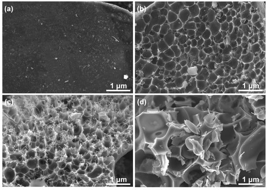 FESEM images of (a) HPC-0, (b) HPC-1, (c) HPC-2 and (d) HPC-3, which were synthesized by adjusting the mass ratio of KOH to the intermediate charcoal as 0:1, 1:1, 2:1, and 3:1, respectively.