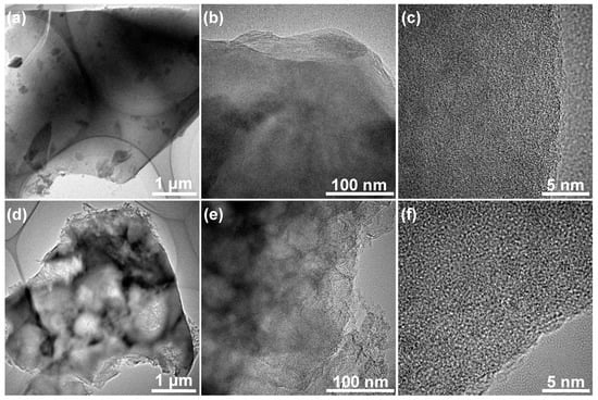 TEM images of (a–c) HPC-0 and (d–f) HPC-2 at different magnifications.