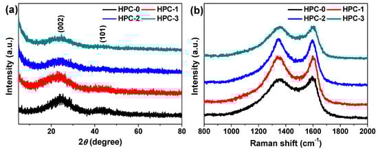 (a) Powder XRD patterns and (b) Raman spectra of HPC-0, HPC-1, HPC-2, and HPC-3.