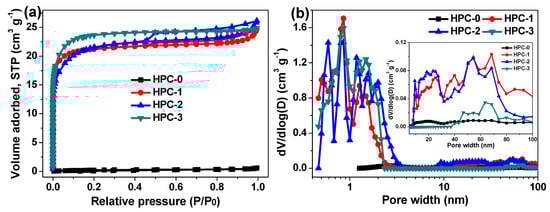(a) N2 adsorption/desorption isotherm curves and (b) Pore size distribution diagrams of HPC-0, HPC-1, HPC-2 and HPC-3.