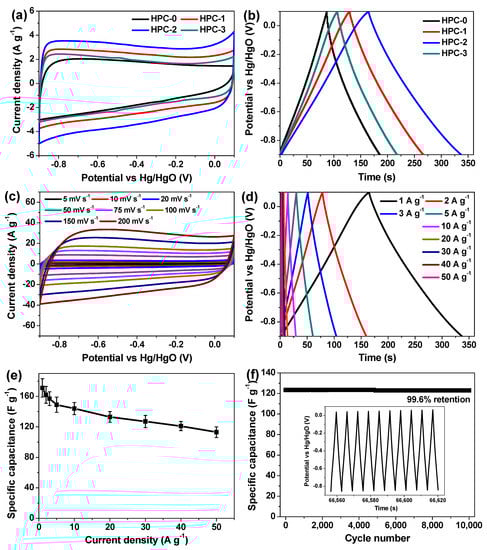 The electrochemical properties of the currently synthesized carbon materials were first studied in 2 M KOH electrolyte by using a three-electrode setup. Figure 6a depicts their CV curves at the scan rate of 20 mV s−1. A seriously distorted rectangular CV curve is obtained for HPC-0. Unlike HPC-0, HPC-1, HPC-2 and HPC-3 show typical quasi-rectangular shapes, demonstrating the EDLC characteristics as supercapacitor electrode materials for charge storage [4,14,21]. Notably, the area enclosed by the CV curve of HPC-2 is significantly larger than that of the others, manifesting the enhanced capacitance of the sample [9,14]. Such result is further verified by their GCD tests at the same current density of 1 A g−1 (Figure 6b), since the discharge time of HPC-2 is the longest [9,14]. The better electrochemical behaviors of HPC-2 possibly benefit from its larger mesopore surface area and mesopore volume to a great extent, which could offer broad channels for shortening the electrolyte ion diffusion distance during charge/discharge processes [14,21]. Figure 6c presents the CV curves of HPC-2 at different scan rates, and the rectangular-like shape is maintained even swept at 200 mV s−1, reflecting its excellent rate performances [21]. Figure 6d is a group of GCD curves of HPC-2 measured at current densities from 1 to 50 A g−1. The discharge curves are almost linear and mirror-symmetric to the charge counterparts with very small IR drop, indicating the good electrical conductivity, desirable charge/discharge activity, and high reversibility of such electrode [4,8,14]. The specific capacitance of this electrode can be deduced according to the following Equation (1),