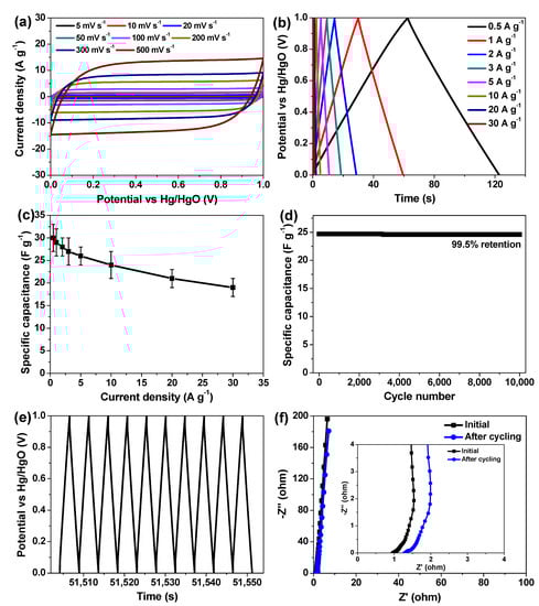 where Cm, I, t, ΔV, and m represent the specific capacitance of the tested working electrode (F g−1), the discharge current (A), the discharge time (s), the potential change during a complete discharge process (V), and the mass of active material coated on the working electrode (g), respectively [14,15,16]. As a result, the Cm value of HPC-2 is calculated to be 171 ± 12, 162 ± 11, 157 ± 9, 149 ± 10, 144 ± 8, 133 ± 7, 127 ± 8, 121 ± 6, and 113 ± 7 F g−1 at the current densities of 1, 2, 3, 5, 10, 20, 30, 40, and 50 A g−1, respectively. Its Cm alteration as a function of current density is profiled in Figure 6e as well. Although the specific capacitance gradually decreases as the current density goes up, the Cm value acquired at the current densities of 10 and 50 A g−1 remains as high as 84.2% and 66.1% of the initial one (i.e., the Cm value acquired at the current density of 1 A g−1), respectively, once again demonstrating the prominent rate capability of HPC-2 electrode. To investigate its cyclic performance, repetitive GCD measurement was performed at the current density of 40 A g−1 for up to 10,000 cycles. Surprisingly, there is almost no capacitance decay from beginning to end, and the capacitance retention of HPC-2 electrode reaches up to 99.6% after the entire test (Figure 6f). In addition, the final 10-cycle charge/discharge curve still retains the quasi-isosceles triangular shape (inset of Figure 6f), commendably illustrating the exceptional long-term cycling stability of the HPC-2 electrode.